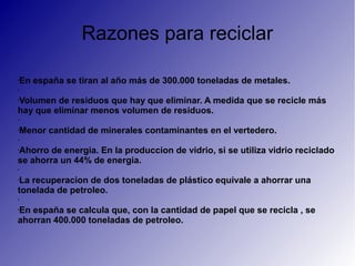 Este documento describe las razones para reciclar y los materiales que se pueden reciclar. Resalta que el reciclaje reduce la cantidad de residuos en los vertederos, ahorra energía y recursos naturales. Menciona que el papel, plástico, vidrio y metal son materiales comúnmente reciclables.