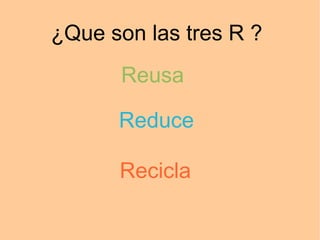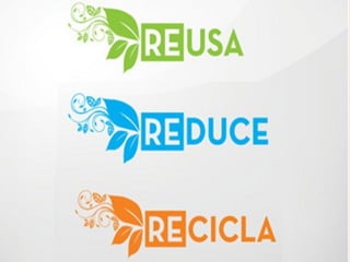 El documento explica las tres erres, que son reutilizar, reducir y reciclar. Estas son estrategias para manejar residuos de forma más sostenible con el medio ambiente. Reutilizar da una segunda vida útil a objetos, reducir usa menos recursos como agua y energía, y reciclar convierte materiales desechados en nuevos productos. El documento también describe formas específicas de reciclaje como de aluminio, vidrio, papel y más, así como cubos de basura y puntos limpios para separar residuos.