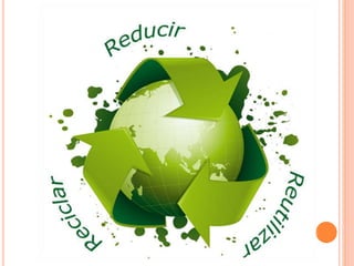 El documento explica el proceso de reciclaje, donde los materiales usados como el papel, vidrio y plástico pueden transformarse en nuevos materiales una vez terminado su uso original. También describe los beneficios del reciclaje como mantener la ciudad limpia, ahorrar energía y reducir la contaminación causada por la extracción de recursos. El reciclaje depende de la participación de millones de personas y puede ayudar a conservar el medio ambiente aunque no resuelve todos los problemas de contaminación.