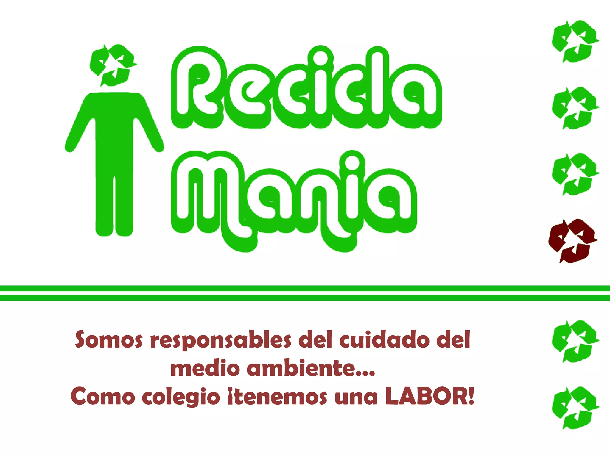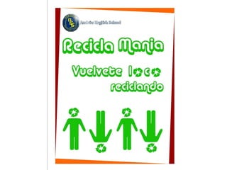 El documento presenta un proyecto desarrollado por un grupo de estudiantes para implementar un programa de reciclaje en un colegio. Luego de probar un primer modelo, lo mejoraron contactando a organizaciones que ofrecieron apoyo gratuito a través de charlas, talleres y traslado de materiales. El nuevo proyecto incluye concursos, charlas, talleres y recolección de basura, y fue aprobado por el colegio para ser implementado.