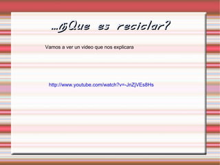 El documento explica el proceso de reciclaje. El reciclaje permite reutilizar partes o elementos de artículos desechados después de un proceso de tratamiento. Al reciclar diferentes materiales como vidrio, plástico, papel y metales, se ahorra energía y recursos naturales. El documento también describe los diferentes tipos de residuos que se pueden reciclar y la importancia de separarlos en los contenedores de color adecuados.