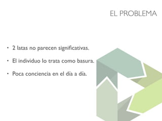 El documento habla sobre la gran cantidad de basura reciclable que termina en vertederos en Chile, equivalente a 3.6 millones de toneladas anuales o 271 kgs por persona. Propone que reciclar 2 latas ahorra la energía de 6 horas de TV y 250 latas diarias por año equivalen a la energía de 9500 litros de gasolina. Finalmente, presenta a Katty y Felipe, el equipo detrás de la solución para aumentar la concientización sobre el reciclaje.