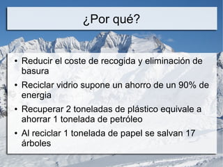 Reciclar es el proceso de reutilizar partes o elementos de un artículo desechado después de un proceso de tratamiento para que puedan ser usados nuevamente. Reciclar ayuda a reducir los costos de recogida y eliminación de basura, ahorrar energía y recursos naturales. Los residuos domésticos se separan en contenedores de diferentes colores según el material, como envases en amarillo, papel y cartón en azul, y vidrio en verde.