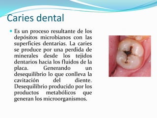 La caries recidivante se produce en los márgenes de una restauración dental cuando existe una desajuste o mal pulido que permite la acumulación de placa bacteriana y la desmineralización del tejido dental circundante. El diagnóstico se realiza principalmente mediante inspección visual ya que permite detectar caries secundarias en esmalte y dentina con alta eficacia. El tratamiento depende de si es necesario reparar o reemplazar la restauración original.
