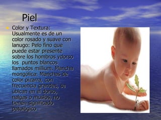 El documento describe las características normales de un recién nacido sano, incluyendo la piel, cabeza, cara, boca, tórax, cordón umbilical, peso, alimentación, digestión, riñones, deposiciones, hipoprotrombinemia y hormonas. Detalla aspectos como el color de la piel, fontanelas, ojos, pulmones, caída del cordón umbilical, pérdida de peso posnatal y desarrollo de las funciones digestivas y renales en las primeras semanas de vida.