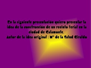 Este documento propone la construcción de un recinto ferial en la ciudad de Calamonte. Se justifica que el recinto se construiría en una zona apartada para evitar problemas de ruido, alojamiento y higiene durante las ferias. El recinto beneficiaría no solo al pueblo sino también a las personas que viven cerca de donde actualmente se celebra la feria. Se propone construirlo junto a una zona de botellón inutilizada.