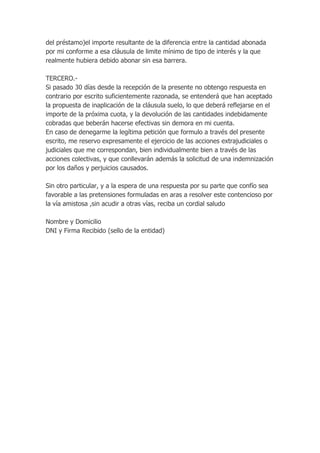 El documento es un modelo de reclamación dirigido a un banco para impugnar la cláusula suelo en un contrato de préstamo, la cual limita la variabilidad del tipo de interés y se considera abusiva. Se solicita la inaplicación de dicha cláusula, el recálculo de las cuotas pagadas y la devolución de los importes cobrados de más. Además, se indica que, si no se recibe respuesta en 30 días, se considerará que el banco acepta la propuesta, reservándose el usuario el derecho a acciones legales en caso de negativa.