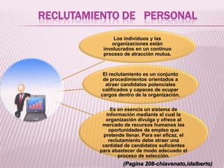El documento habla sobre el proceso de reclutamiento de personal en las organizaciones. Explica que el reclutamiento implica atraer candidatos calificados para cubrir puestos dentro de la organización. Detalla los objetivos, factores que influyen, y restricciones del proceso de reclutamiento. Asimismo, describe las distintas fuentes, técnicas y ventajas e inconvenientes del reclutamiento interno y externo. Finalmente, resume que el reclutamiento es un sistema de información para que las organizaciones divulguen sus oportunidades labor