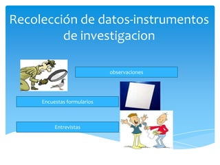 Este documento describe tres instrumentos de investigación: observaciones, encuestas y entrevistas. Explica que las observaciones deben realizarse de manera estructurada y documentada para ser válidas, anotando detalles como la hora, lugar y personas involucradas. También cubre que las entrevistas son similares a los cuestionarios pero con el encuestador anotando las respuestas. El documento provee información básica sobre cómo utilizar estos tres métodos para recopilar datos en un proyecto de investigación.