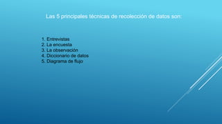 Las cinco principales técnicas de recolección de datos son: entrevistas, encuestas, observación, diccionario de datos y diagrama de flujo. Las entrevistas involucran conversaciones dirigidas con preguntas y respuestas. Las encuestas usan preguntas normalizadas para obtener perfiles de opiniones de una muestra representativa. La observación implica observar actividades para comprender cómo se realizan. El diccionario de datos describe elementos de un sistema. Y el diagrama de flujo representa los pasos de un proceso gráficamente.