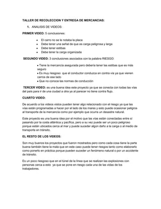 Este documento resume las conclusiones de varios videos sobre el análisis de riesgos en la recolección y entrega de mercancías. Algunas de las conclusiones son que los vehículos de carga deben tener placas visibles, señalización para cargas peligrosas y largas, estibas y carga organizada. También se identificaron riesgos como conducir en contraflujo, falta de normas de conducción y desastres naturales que podrían dañar la carga al transportarla cerca del mar. Finalmente, se señala que si
