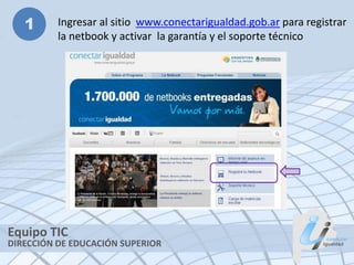 Este documento proporciona 8 recomendaciones para el uso y mantenimiento de las netbooks entregadas en el programa Conectar Igualdad. Estas incluyen registrar la netbook y activar la garantía, registrar el paquete Office, actualizar periódicamente el antivirus, conectarse a la red WIFI de la escuela, actualizar los certificados de seguridad, utilizar la función de restauración del sistema, almacenar archivos personales en el disco D, y acceder regularmente al sitio web del programa para mantenerse informado.