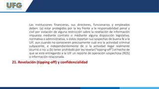 Este documento establece recomendaciones para combatir el lavado de dinero y el financiamiento del terrorismo. Indica que las instituciones financieras no deben ser responsables legalmente si reportan sus sospechas de buena fe a las autoridades, y deben mantener la confidencialidad de dichos reportes. También señala que los requisitos de debida diligencia y registro se aplican a las actividades y profesiones no financieras designadas, y que abogados y contadores deben reportar operaciones sospechosas. Finalmente, enfatiza la importancia