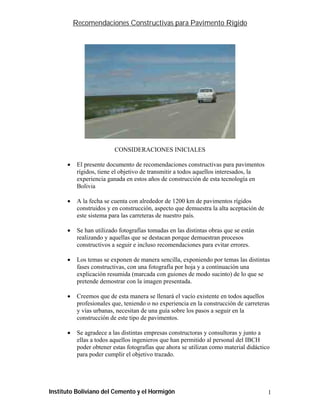 Este documento presenta recomendaciones para la construcción de pavimentos rígidos en Bolivia basadas en la experiencia de 1200 km construidos. Explica los procesos constructivos a seguir en las distintas fases como movimiento de tierras, producción de material de subbase, conformación de subbase, explotación de agregados y producción de hormigón, ilustrando cada tema con fotografías y breves descripciones. El objetivo es servir de guía para profesionales interesados en esta tecnología.