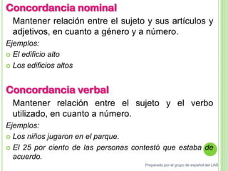 El documento ofrece recomendaciones generales sobre la concordancia nominal y verbal, el uso de tiempos verbales, la conjugación correcta de verbos, y otras consideraciones como evitar vicios del lenguaje y consultar diccionarios.