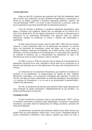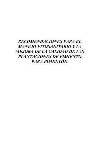 Este documento proporciona recomendaciones para mejorar la calidad y productividad de las plantaciones de pimiento en el Valle del Guadalentín. El principal riesgo son el trips Frankliniella occidentalis y el virus del bronceado que transmite. Se recomienda eliminar plantas infectadas, respetar insectos benéficos que controlan el trips, y solo usar tratamientos compatibles con los auxiliares. El control biológico es más eficaz que el químico para el trips. También se abordan recomendaciones para pulgones, fertilidad del