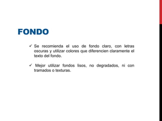 Este documento proporciona recomendaciones para crear diapositivas en PowerPoint de manera efectiva. Se recomienda usar fondos claros con letras oscuras, mantener una imagen corporativa coherente, limitar el texto a unas pocas frases por diapositiva, usar fuentes legibles, incluir imágenes de alta calidad, contrastar colores en tablas y figuras, y usar animaciones y transiciones simples sin distraer al público.