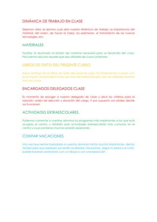 El documento ofrece consejos sobre qué hacer el primer día de clase. Se recomienda presentarse al alumnado, pasar lista, entregar horarios, presentar a los profesores especialistas, mostrar las instalaciones, establecer normas, explicar la dinámica de trabajo, facilitar materiales, entregar libros de texto, elegir delegado de clase, comentar actividades extraescolares y dejar tiempo para que los alumnos hablen de sus vacaciones.