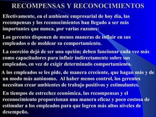 El reconocimiento y las recompensas son esenciales en el ambiente laboral actual, donde los gerentes deben fomentar un entorno positivo sin recurrir a la coerción. Para ser eficaces, los programas de recompensas deben ser adaptados, variados y reflejar los valores de la empresa, y es importante que las formas de reconocimiento no siempre impliquen costos. Agradecimientos sinceros y reconocimientos oportunos pueden ser más valiosos que recompensas monetarias, lo que resalta la importancia del aprecio genuino en el trabajo.