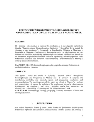 Este informe presenta los resultados de una investigación sobre la geomorfología, geología y geografía de la ciudad de Abancay y sus alrededores en Perú. Analiza los fenómenos geodinámicos internos como los sismos, y externos como las avalanchas, aluviones, deslizamientos de tierra e inundaciones. Determina la vulnerabilidad de Abancay ante desastres naturales y ofrece recomendaciones para mitigar el riesgo, incluyendo un programa de mitigación popular.