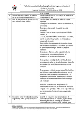 El taller tiene el objetivo de reconocer y analizar el Reglamento del Aprendiz del SENA para gestionar debidamente cada situación que se presente durante el proceso de formación. El taller consiste en dividir a los participantes en equipos para que respondan preguntas sobre el contenido y organización del Reglamento en un máximo de 1 hora. Al final, se socializarán las respuestas para unificar criterios sobre la aplicación correcta del Reglamento.