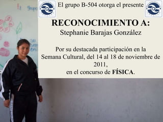 El grupo B-504 otorgó un reconocimiento a Stephanie Barajas González por su destacada participación en la Semana Cultural del 14 al 18 de noviembre de 2011, específicamente en el concurso de Física.