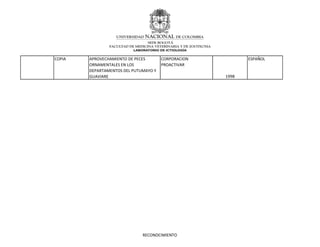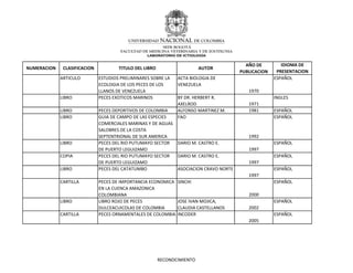 Este documento lista varios libros y publicaciones sobre peces de América del Sur, principalmente de Colombia y Venezuela, incluyendo estudios sobre la ecología de los peces de los llanos venezolanos, peces deportivos de Colombia, peces marinos y de aguas salobres de Suramérica, peces del río Putumayo en Colombia, peces del río Catatumbo en Colombia, peces de importancia económica en la cuenca amazónica colombiana, el libro rojo de peces dulceacuícolas de Colombia, peces ornamentales