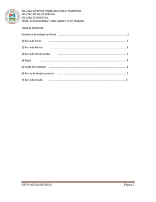 El documento describe los siete elementos básicos del ambiente de trabajo en Microsoft Word, incluyendo la barra de título, barra de menús, barra de herramientas, regla, punto de inserción, barras de desplazamiento y barra de estado. Explica la función de cada elemento y cómo ayudan a los usuarios a navegar y editar documentos en Word.