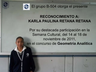 El grupo B-504 otorgó un reconocimiento a Karla Paulina Retana Retana por su destacada participación en la Semana Cultural del 14 al 18 de noviembre de 2011, específicamente en el concurso de Geometría Analítica.