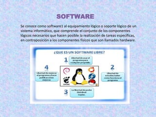 El hardware se refiere a las partes físicas y tangibles de un sistema informático, como cables, gabinetes, periféricos y otros componentes electrónicos, electromecánicos y mecánicos. El software son los componentes lógicos que hacen posible que el hardware realice tareas específicas y comprende programas y datos. Algunas de las partes internas fundamentales de una computadora incluyen el disco duro, la tarjeta madre, la memoria RAM y la fuente de poder.