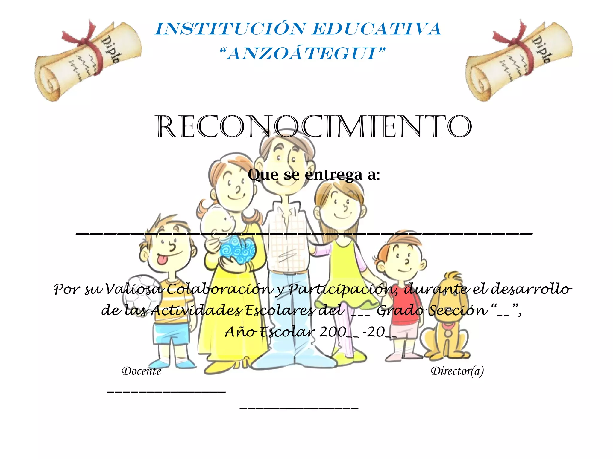 Este documento es un certificado de reconocimiento para un estudiante por su valiosa colaboración y participación durante el año escolar en el grado y sección especificados. El certificado está firmado por el docente y el director de la Institución Educativa "Anzoátegui".