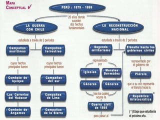 La reconstrucción nacional en el Perú se refiere al período entre 1880-1920 en el que el país se reconstruyó después de la devastadora Guerra del Pacífico con Chile. Este proceso estuvo marcado por inestabilidad política y el ascenso de caudillos militares al poder, y buscó restaurar la economía a través de contratos que aumentaron la dependencia extranjera. La reconstrucción progresó bajo gobiernos civiles y militares y sentó las bases para el desarrollo del Perú en el siglo XX.