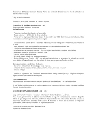 Este documento resume la historia del Perú desde el periodo de Reconstrucción Nacional luego de la guerra con Chile hasta el segundo gobierno de José Pardo y Barreda. Cubre el Segundo Militarismo, la República Aristocrática dominada por la oligarquía civilista, y los gobiernos sucesivos que intentaron reconstruir el país y enfrentaron problemas económicos y sociales. Resalta las luchas entre facciones militares y civiles por el poder político y el surgimiento del movimiento obrero.