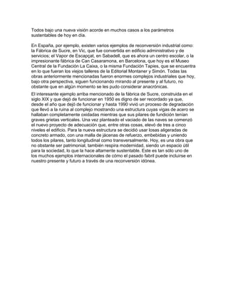La reconversión industrial en España a comienzos de los años 80 supuso el recorte de la capacidad productiva y el empleo en industrias tradicionales en crisis para adaptarlas a la nueva situación económica. Entre las medidas se incluyeron el saneamiento financiero de las empresas, la eliminación del exceso de producción y la reducción de plantillas laborales. Actualmente, muchas antiguas fábricas en España se han reconvertido con éxito a nuevos usos como edificios administrativos, centros escolares o museos, preservando el patri