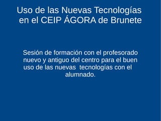 El documento describe una sesión de formación para el profesorado del CEIP Ágora de Brunete sobre el uso de las nuevas tecnologías con los estudiantes. El colegio cuenta con una variedad de recursos tecnológicos como pizarras digitales, tabletas, ordenadores y redes wifi para mejorar el aprendizaje de los estudiantes de manera interactiva.