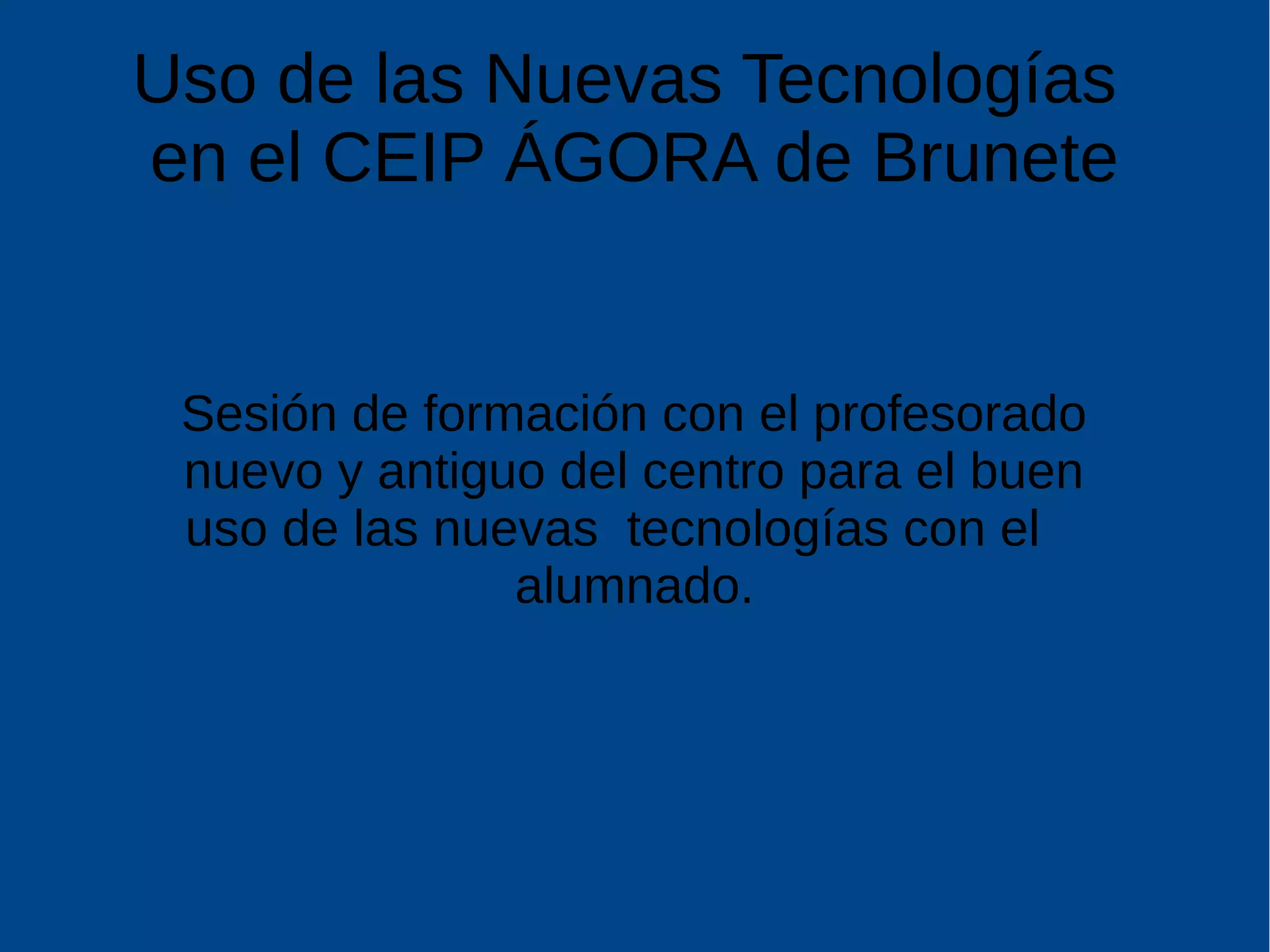 El documento describe una sesión de formación para el profesorado del CEIP Ágora de Brunete sobre el uso de las nuevas tecnologías con los estudiantes. El colegio cuenta con una variedad de recursos tecnológicos como pizarras digitales, tabletas, ordenadores y redes wifi para mejorar el aprendizaje de los estudiantes de manera interactiva.