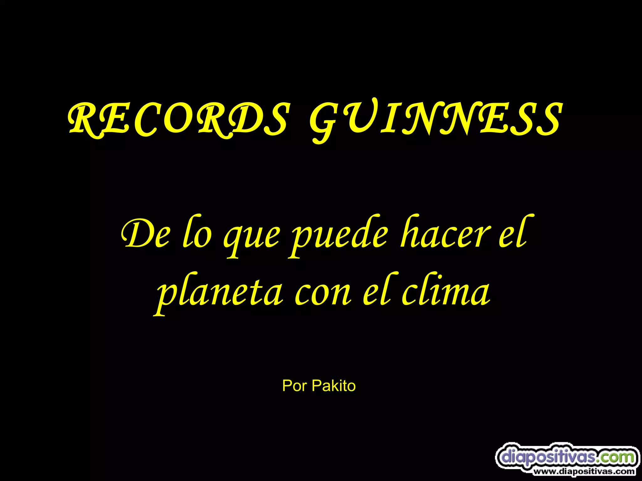 El documento presenta varios récords Guinness relacionados con fenómenos climáticos extremos. Incluye el tornado más grande registrado en Oklahoma en 1999, el nivel más bajo de ozono sobre la Antártida en 1993, y el rayo más mortífero que impactó un avión en 1963 causando 81 muertes. También menciona la mayor diferencia de temperatura registrada en un solo lugar en Montana en 1916, el lugar más seco en el desierto de Atacama en Chile, y la mayor precipitación anual en la India debido al monzón asiático.