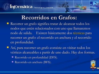 Este documento describe dos técnicas para recorrer un grafo: recorrido en profundidad (DFS) y recorrido en anchura (BFS). El DFS busca los caminos más largos primero mientras que el BFS visita los nodos por niveles de distancia desde el nodo inicial. Se proveen ejemplos y pseudocódigo para implementar DFS y BFS usando una cola y marcando vértices visitados.