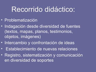 El documento describe los principios y estrategias clave para enseñar ciencias sociales. Estos incluyen indagar desde múltiples perspectivas, confrontar ideas a través del diálogo, y sistematizar el conocimiento usando varias fuentes de información y modos de representación. El enfoque busca comprender fenómenos desde una perspectiva de complejidad que reconoce la diversidad de actores y el contexto histórico.