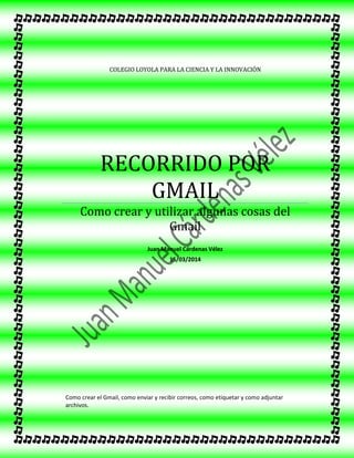 Este documento explica cómo crear y utilizar una cuenta de Gmail. Detalla los pasos para crear una cuenta, incluyendo proporcionar información personal y aceptar los términos del servicio. También explica cómo enviar y recibir correos electrónicos, etiquetar mensajes, y adjuntar archivos a los correos.