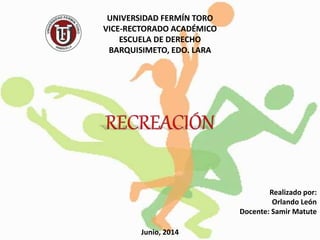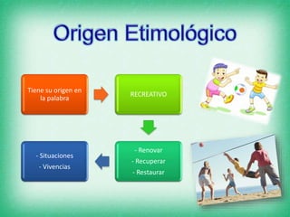 La recreación es un conjunto de actividades lúdicas y creativas que se realizan en el tiempo libre para satisfacer las necesidades básicas del individuo. Contribuye a mejorar la calidad de vida mediante la interacción social y permite relaciones humanas sanas. Algunas formas de recreación incluyen juegos, bailes, música, deportes, literatura y actividades al aire libre.