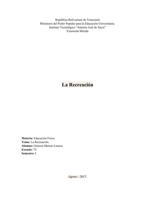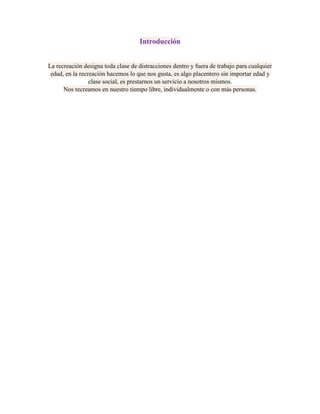 Este documento define la recreación como actividades realizadas libremente durante el tiempo libre que generan bienestar físico y espiritual. Describe los principios de la recreación como proporcionar oportunidades para el desarrollo infantil a través del juego y ayudar a los niños y adultos a descubrir actividades que les brindan satisfacción. También caracteriza a la recreación como una actividad voluntaria, placentera y funcional para el autodesarrollo que promueve valores como el respeto, el amor y la honestidad.