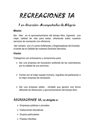 Recreaciones 1A es una empresa de recreación con la misión de ser líder en el aprovechamiento del tiempo libre para mejorar la calidad de vida de todos mediante la eficiencia en sus servicios recreativos. La empresa ofrece una amplia gama de actividades recreativas para empresas, instituciones educativas, grupos y fiestas, incluyendo eventos promocionales, campamentos, tours turísticos y fiestas infantiles.