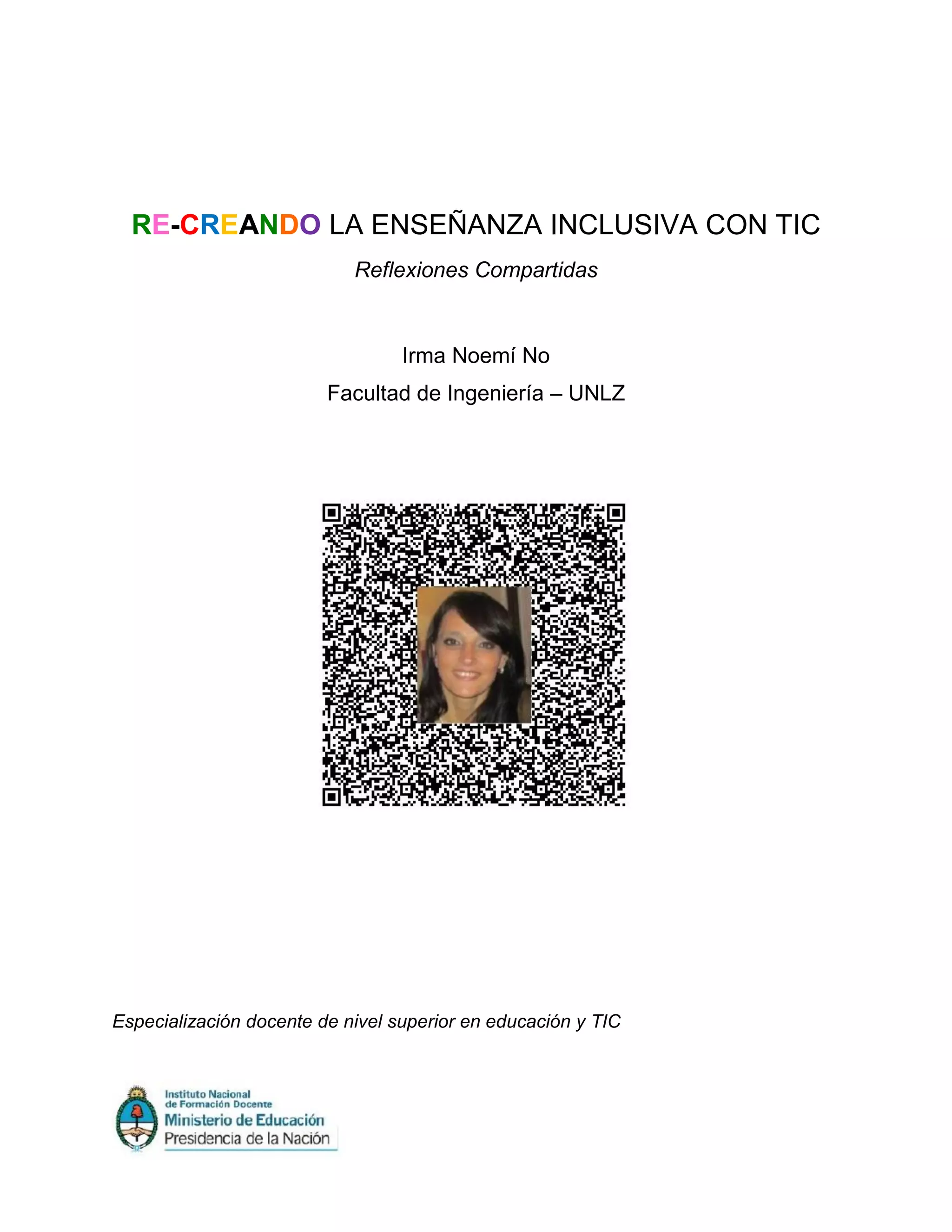 Este documento presenta una propuesta para recrear la enseñanza inclusiva mediante la integración de las TIC. Reconoce que las TIC son parte de la realidad de los estudiantes y propone usarlas como herramientas de aprendizaje para promover la equidad y desarrollar competencias. Describe un plan de capacitación docente que enseña a integrar las TIC de manera contextualizada y centrada en el estudiante. Finalmente, concluye que contamos con las condiciones necesarias como decisión política, recursos tecnológicos,