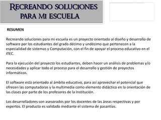 El proyecto "Recreando soluciones para mi escuela" busca que los estudiantes de los grados 10 y 11 de la especialidad de Sistemas y Computación del ITEC diseñen y desarrollen software educativo para apoyar el proceso de enseñanza en la institución. El software es desarrollado siguiendo el proceso completo de gestión de proyectos informáticos y es validado por docentes y estudiantes para verificar su utilidad.