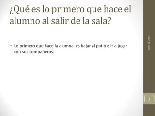 El documento describe la experiencia típica de recreo de un estudiante de 1° medio. Al sonar el timbre, el estudiante sale corriendo al patio para jugar con amigos y comer una merienda. Sus actividades favoritas incluyen saltar la cuerda, jugar con muñecas y juegos de captura. Se siente feliz durante la mayor parte del recreo.