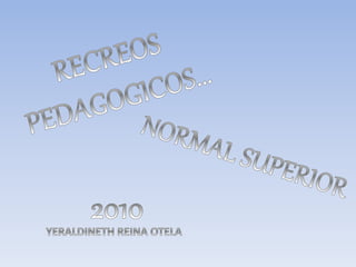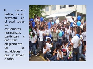 El documento describe un proyecto recreativo para estudiantes normalistas que integra actividades artísticas como música, danza y teatro durante los recreos. Estas actividades contribuyen al desarrollo integral de los estudiantes y permiten que expresen su creatividad mientras fomentan valores como la sensibilidad, el respeto y la solidaridad. Adicionalmente, el proyecto genera una mayor dinámica e integración entre los estudiantes y maestros durante los descansos.
