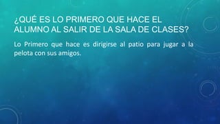 El alumno sale rápidamente de la sala de clases y corre al patio de recreo, donde come una merienda ligera y juega fútbol con sus amigos en la cancha durante todo el recreo, divirtiéndose y sintiéndose libre. Cuando suena la campana, corre de vuelta a la sala de clases sin demora.