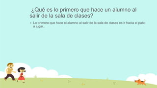 Los alumnos salen corriendo de la sala de clases hacia el patio para jugar. Durante el recreo comen fruta o jugo mientras juegan fútbol, escondidas u otros juegos recreativos en grupos que pueden cambiar. Se instalan en la parte central del patio y cuando suena el timbre se emocionan, aunque entran tristes a clase porque no pueden seguir jugando.