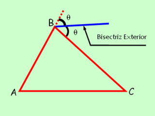 El documento describe varios puntos y líneas notables en un triángulo, incluyendo la mediana, bisectriz, altura, mediatriz, baricentro, ortocentro, incentro, excéntrico y circuncentro. También explica cómo la ubicación del circuncentro depende del tipo de triángulo y que el ortocentro, baricentro y circuncentro se ubican en la recta de Euler en todo triángulo no equilátero.